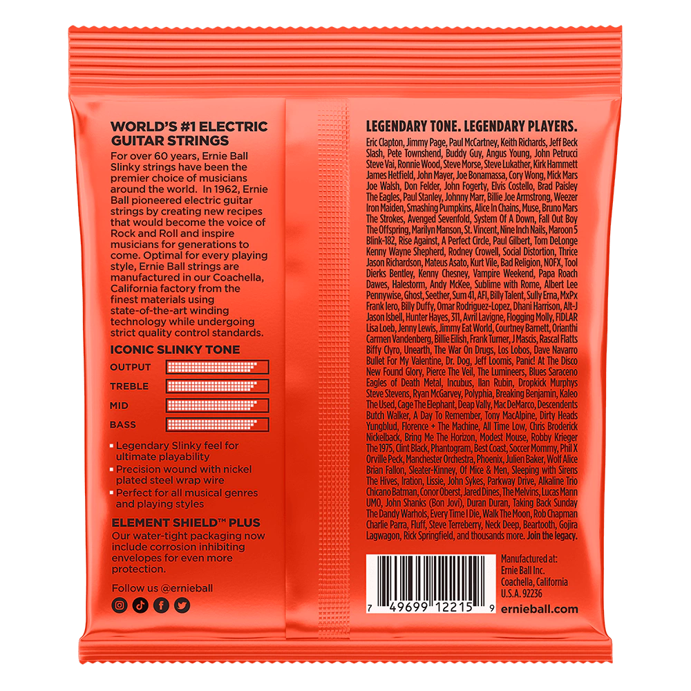 Las cuerdas de guitarra eléctrica entorchadas en níquel de Ernie Ball están hechas de alambre de acero niquelado envuelto alrededor de un núcleo de acero hexagonal estañado. Las cuerdas simples están hechas de acero con alto contenido de carbono estañado especialmente templado que produce un tono bien equilibrado para su guitarra. Parte superior delgada y parte inferior pesada. Calibres .010, .013, .017, .030, .042, .052
