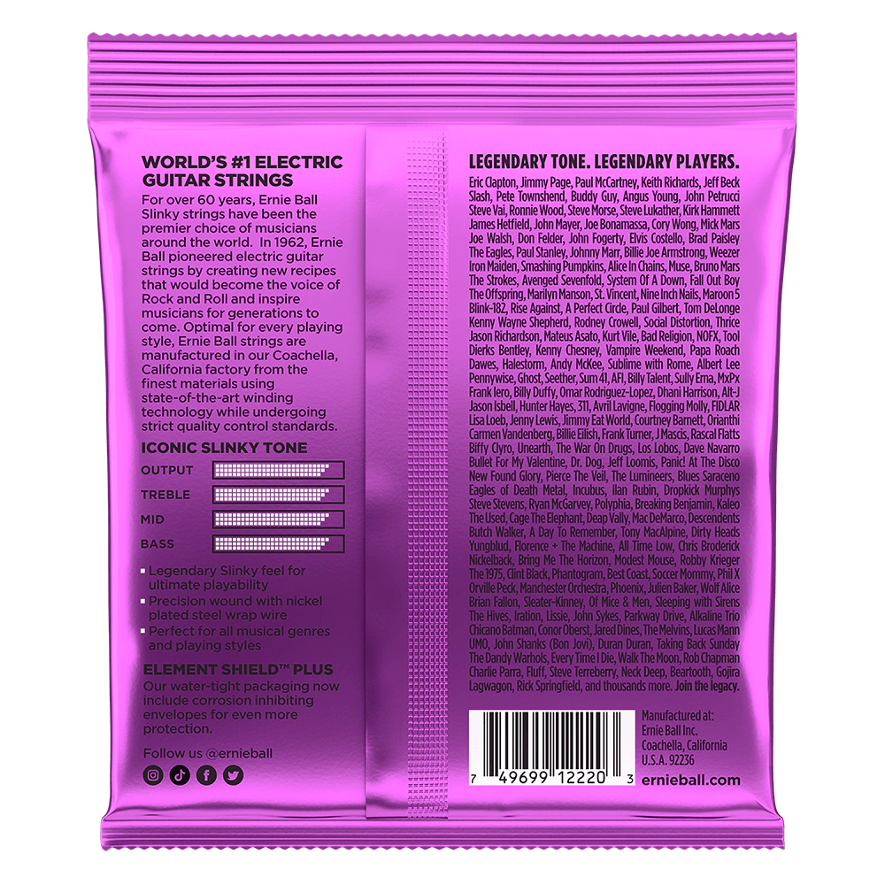 Las cuerdas de guitarra eléctrica entorchadas en níquel de Ernie Ball están hechas de alambre de acero niquelado envuelto alrededor de un núcleo de acero hexagonal estañado. Las cuerdas simples están hechas de acero con alto contenido de carbono estañado especialmente templado, lo que produce un tono bien equilibrado para su guitarra. Calibres .011, .014, .018p, .028, .038, .048